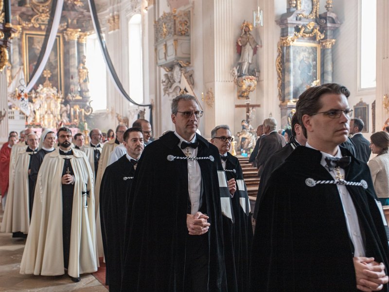Nach dem Pontifikalamt mit Hochmeister Frank Bayard OT, welches musikalisch durch den Weyeraner Kirchenchor gestaltet wurde, kamen Ordensbrüder der Provinzen Deutschland, Tschechien und Südtirol, Familiare, Freunde und Angehörige der beiden Neuprofessen im Klosterhof zusammen.